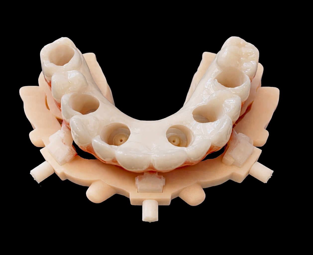 Pinned into place with 3–4 anchor pins, the bone reduction guide allows for extraction of remaining teeth or bone reduction. It is customized to the clinician’s preferences and can be manufactured from PMMA, nano-ceramic, or metal, depending on strength requirements. Once secured, the verification guide is removed, and the planned bone modification is performed.